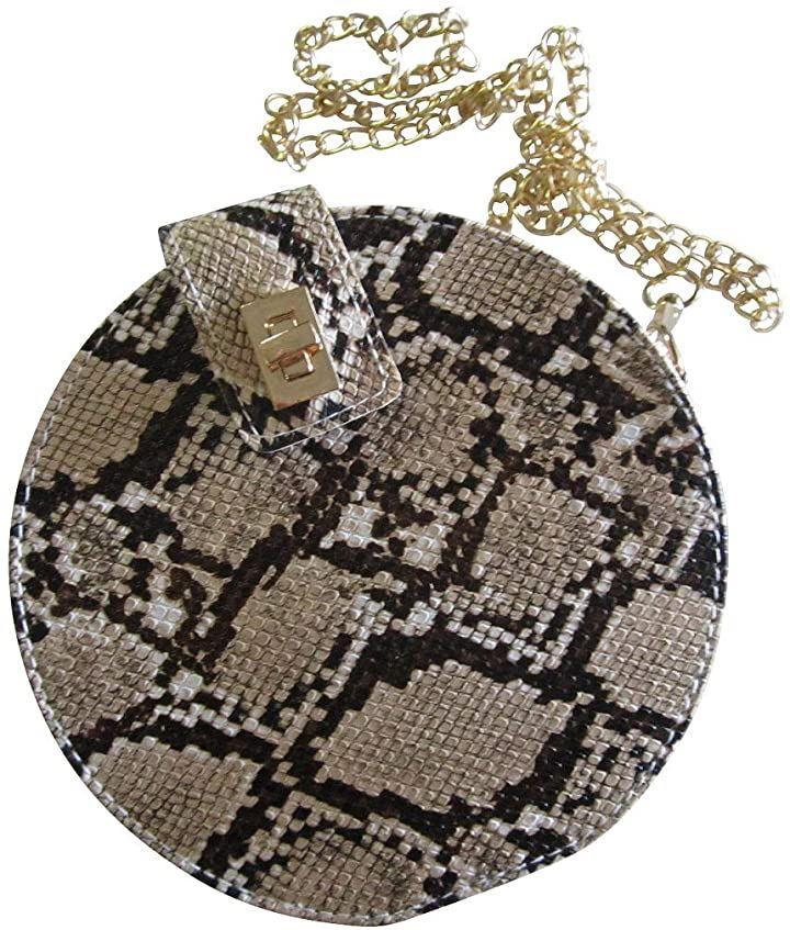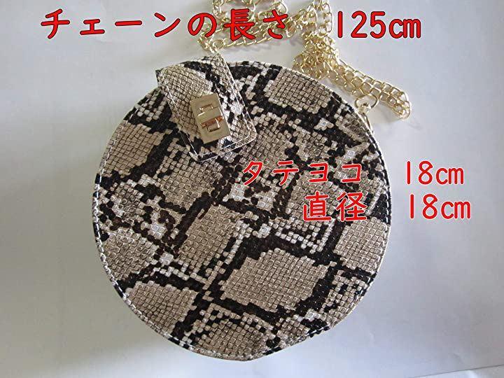 ・表面には高級感あるヘビ柄をデザイン 丸形スマホポシェット ななめ掛けミニバッグのサイズはタテ・ヨコ直径18cm、厚み6cm、240グラム、軽く邪魔になりません。