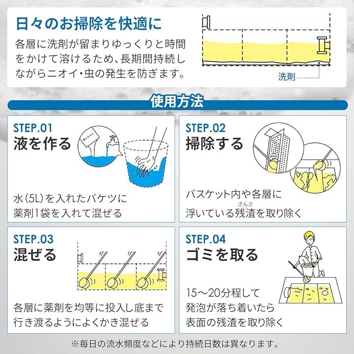 「使用上の注意」固形物・汚泥などは分解できませんので、網ですくうか年に数回バキューム処理が必要です。