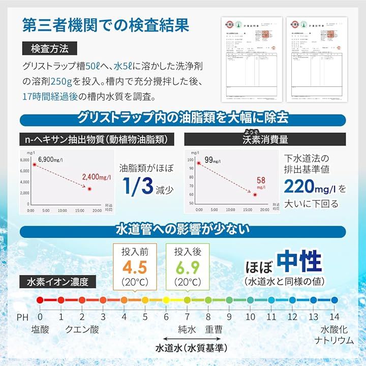 一般的なグリストラップ用の洗剤は、綺麗になるものの油分が乳化する・ニオイが若干残る・手袋必須など気になる点もしばしば…。