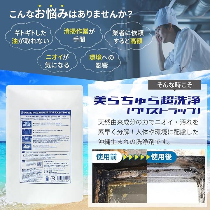 長年溜まったギトギト油が取れない・掃除に手間と時間がかかる・専門業者に依頼すると費用がかさむ・常にニオイが気になる・環境に悪そう…といったグリストラップのお悩みを解消。天然由来の力で油汚れや嫌なニオイを素早く分解してくれる「美らちゅら超洗浄」です。