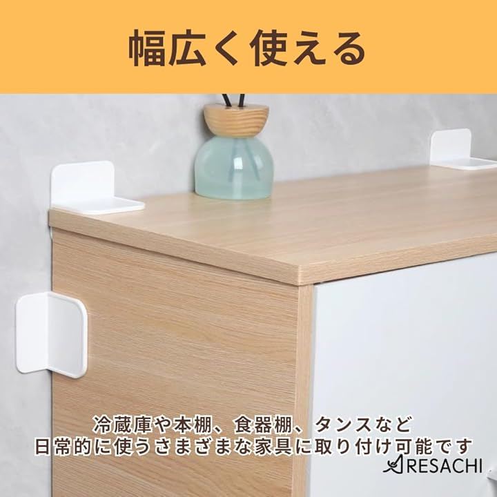 「冷蔵庫や本棚など幅広く使える」本棚、食器棚、タンスなど、日常的に使うさまざまな家具に取り付け可能です。