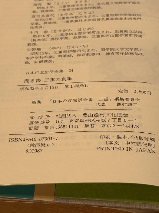 g01-260127003002015-000聞き書 三重の食事 農山漁村文化協会 三重の食事編集委員会伊勢平野の世例祭、紀伊山間の山の神、伊賀のめし食い祭、志摩のお盆料理などの食べものをはじめ、伊勢神宮の神饌、お伊勢参りの食も紹介される。日常の食も豊富。9784540870019<%% SHIPPING %%>三方小口に若干のホコリシミ・斑点があります。本は経年感、使用感ございますが読むことに支障はございません。※注意事項※■商品・状態はコンディションガイドラインに基づき、判断・出品されております。■付録等の付属品がある商品の場合、記載されていない物は『付属なし』とご理解下さい。