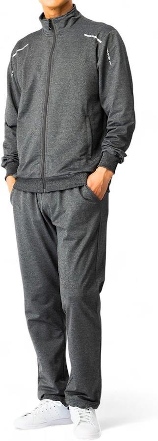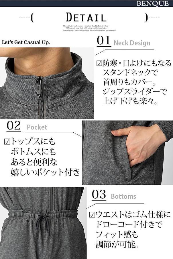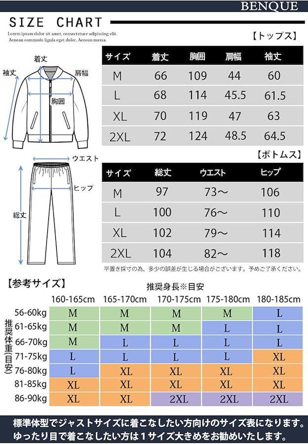 *素材:ポリエステル 95%,ポリウレタン 5% *カラー:ブラック、グレー、ネイビー *サイズ:M,L,XL,2XL トップス 着丈 /胸囲 /肩幅 /袖丈 [M] : 66 / 109 / 44 / 60 [L] : 68 / 114 / 45.5 / 61.5 [XL] :70 / 119 / 47 / 63 [2XL] :72 / 124 / 48.5 / 64.5 ボトムス 総丈 /ウエスト(ゴム仕様) /ヒップ [M] : 97 / 73~ / 106 [L] : 100 / 76~ / 110 [XL] :102 / 79~ / 114 [2XL] :104 / 82~ / 118