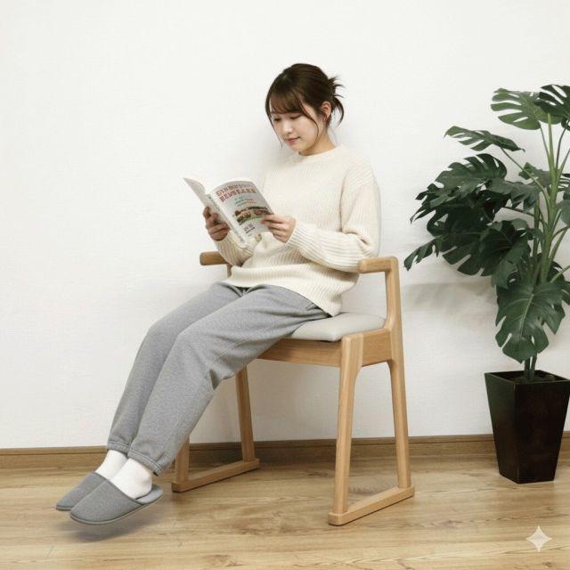 立ち座りがラクになる、安心設計の「肘付ちょい掛けスツール」。肘掛け付きで、座るときも立ち上がるときも手を添えられるため、脚に不安のある方やご高齢の方にぴったりの一脚です。