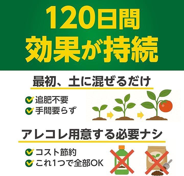 「追肥不要の持続力」肥効が驚きの120日間。一般的な肥料の4倍の持続力で、面倒な追肥作業を大幅に削減します。