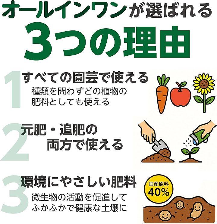 「国産原料使用」:海外原料への依存度が高い一般的な化成肥料とは異なり、約40%を国内由来の原料で構成。