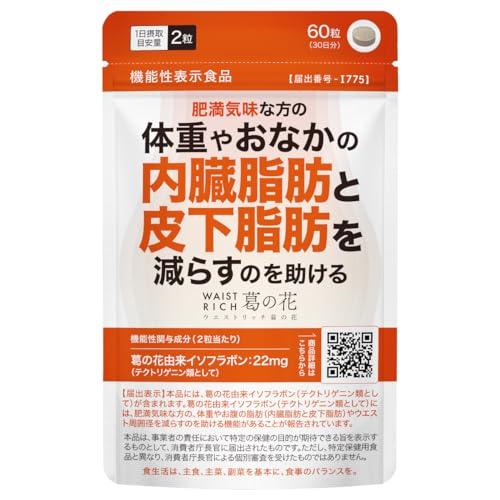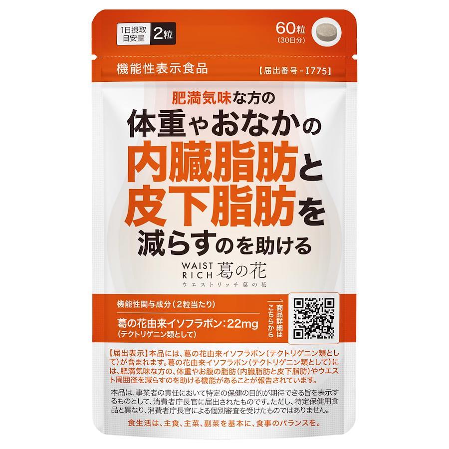 ぽっこりおなかの対策に。機能性関与成分『葛の花由来イソフラボン(テクトリゲニン類として)』を22mg配合(※1)、肥満気味な方(※2)の【体重】、おなかの【内臓脂肪・皮下脂肪】、【ウエスト周囲径】の減少を助ける機能性表示食品。国内製造。 【 機能性関与成分 】葛の花由来イソフラボン(テクトリゲニン類として)22mgを肥満気味の方(※2)が12週間摂取したところ、体重・おなかの内臓脂肪・おなかの皮下脂肪・ウエスト周囲径が有意に減少したことが報告されています。 【 メカニズム 】葛の花由来イソフラボン(テクトリゲニン類として)の、< 脂肪がつくられるのを阻害 >< 脂肪の分解を促進(白色脂肪細胞にて) >< 脂肪の消費を促進(褐色脂肪細胞にて) > の3つの働きで、肥満気味(※2)なお悩みへ本格アプローチ(※3)! 【 サポート成分22種類 】、1日目安量たった2粒にサポ-ト成分22種類を独自にプラス配合。サラシア抽出物や黒胡椒抽出物、ギムネマシルベスタ抽出物、ビタミン7種類、必須アミノ酸2種類、ミネラル3種類など健康維持に欠かせない多様な成分が頑張るあなたを力強くサポ-トします。 【 3つのフリー処方 】着色料・甘味料・香料 (※1)1日目安量2粒あたり (※2)BMIが23~30未満の健常な成人 (※3)機能性表示食品の届出に記載されている内容を基にしています。