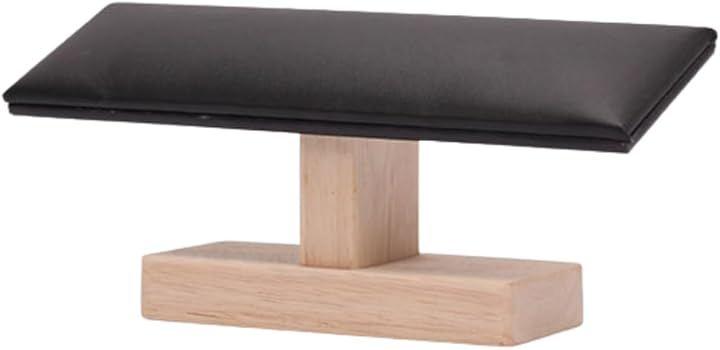 「高級感漂う天然木製スタンド」美しい天然木とスエード調クッションを組み合わせ、腕時計やアクセサリーを上品にディスプレイできます。