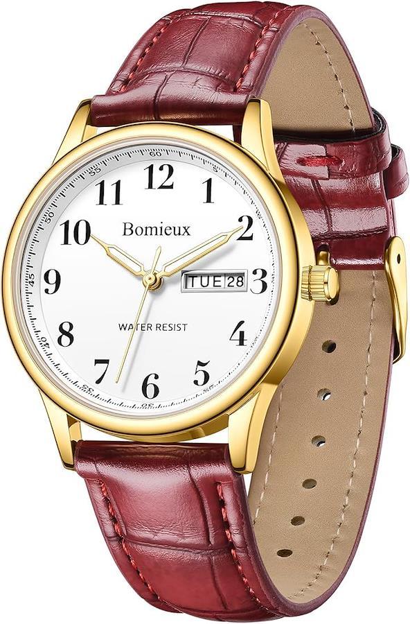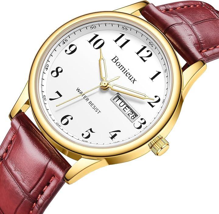 [日付と曜日表示クォーツウォッチ]クラシックでスタイリッシュなダイヤル、ユニークなデザインのみを維持し、エレガントなブラックのアワーマーカーと小さな日付ウィンドウ。