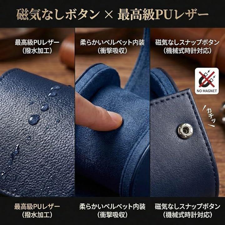 「横ズレしない、スナップボタン固定式」本製品は 時計を巻くクッション自体に装備された「スナップボタン」で、両サイドのボタンをケース本体と直接「パチン」と留めることで、クッションと箱がしっかりと固定されるので、移動中に揺れても時計同士がぶつかる心配はありません。