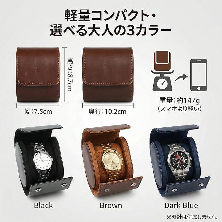 「仕様・サイズ」 サイズ:幅7.5cm x 奥行710.2cm x 高さ8.7cm 重量:約147g(スマホより軽い軽量設計) 収納可能サイズ:ケース径60mm以下の腕時計、スマートウォッチに対応(厚みのある時計も収納可能)