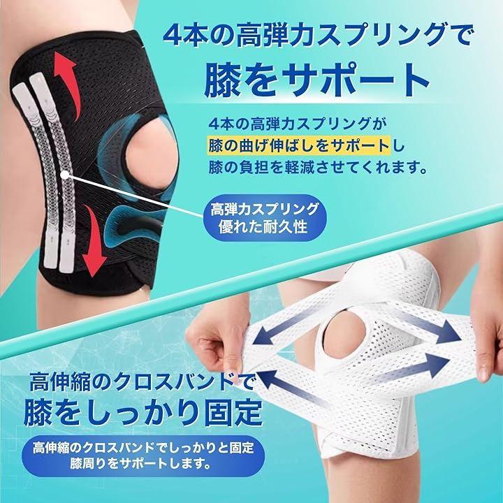 「特殊スプリング内蔵でしっかり支える高機能設計」この膝サポーターには、左右に2本ずつの特殊スプリングを内蔵し、膝関節の自然な動きをしっかりとサポート。