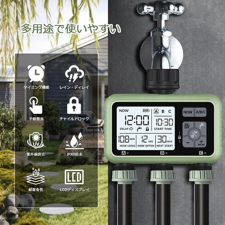 「3つの独立した散水エリア&真鍮材料インターフェイス」:この新しくアップグレードされた灌漑システムは、3つの独立したバルブが装備されている、あなたはより柔軟にあなたの散水計画を設定し、1台のマシンのデュアル-目的機能を実現することができます。