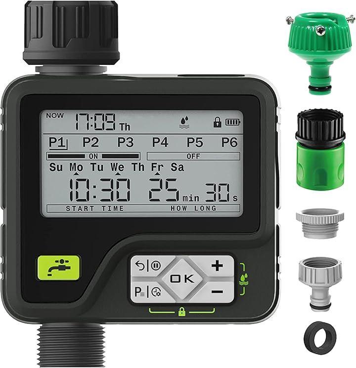 「6つの個別灌漑モード」:スプリンクラータイマーは、あなたの異なる需要を満たすために6つの別々の散水プログラムを提供し、カスタマイズされた灌漑頻度と期間を使用して各散水スケジュールを設定します。