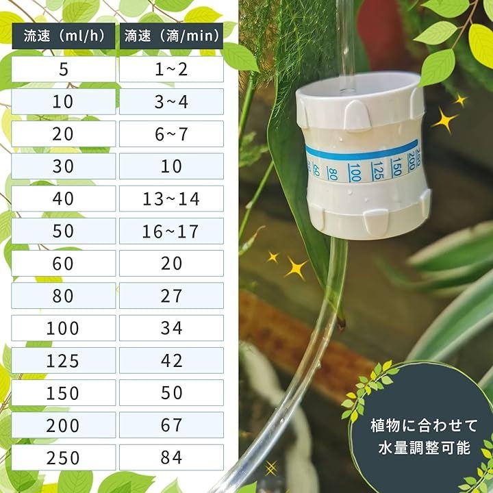 「ダイヤル式で簡単調整|植物に合わせた自動水やり機」 毎時10~300mlまで水量調整が可能。