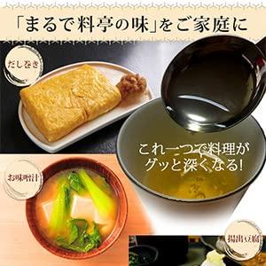 料亭の味をご家庭に。これ一つで料理がぐっとしまる。 出汁巻き(だし巻き)、お味噌汁(おみそ汁)、おでん、揚げ出し豆腐、お雑煮(おぞうに)、茶碗蒸し(ちゃわんむし)、伊達巻(だし)、鍋料理(なべ)、うどん出汁など、和食も洋食も中華料理にも使えて便利な万能のおダシです。