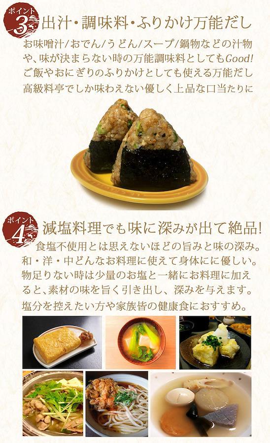 出汁巻き(だし巻き)、お味噌汁(おみそ汁)、おでん、揚げ出し豆腐、お雑煮(おぞうに)、茶碗蒸し(ちゃわんむし)、伊達巻(だし)、鍋料理(なべ)、うどん出汁など、和食も洋食も中華料理にも使えて便利な万能のおダシです