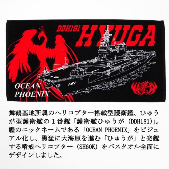 商品名:自衛隊グッズ バスタオル ( 護衛艦ひゅうが ) 海上自衛隊 タオル スポーツ観戦 アウトドア キャンプ ジム 綿 綿100%海上自衛隊 「護衛艦ひゅうが」のバスタオルです。舞鶴基地所属のヘリコプター搭載型護衛艦、ひゅうが型護衛艦の1番艦「護衛艦ひゅうが(DDH181)」。艦のニックネームである「OCEAN PHOENIX」をビジュアル化し、勇猛に大海原を進む「ひゅうが」と発艦する哨戒ヘリコプター (SH60K)をバスタオル全面にデザインしました。完全国内生産で仕上げられたタオルは印刷面はシャーリング仕上がりで肌触りが良く、裏面のパイルでしっかりと水分を吸い取ってくれます。●大きさ:約60cm×120cm●素材:綿100%●日本製