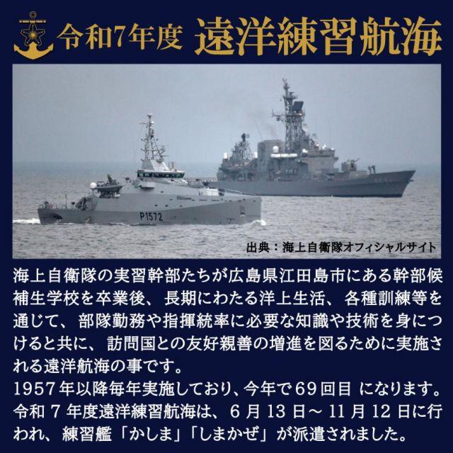 商品名:自衛隊 ワッペン 海上自衛隊 練習艦隊遠洋航海 2025年記念 ベルクロ付 Type1 海上自衛隊グッズ 自衛隊グッズ パッチ 刺繍 メール便可【遠洋練習航海とは】海上自衛隊の実習幹部たちが広島県江田島市にある幹部候補生学校を卒業後、長期にわたる洋上生活、各種訓練等を通じて、部隊勤務や指揮統率に必要な知識や技術を身につけると共に、訪問国との友好親善の増進を図るために実施される遠洋航海の事です。1957年以降毎年実施しており、今年で69回目 になります。令和7年度遠洋練習航海は、6月13日~11月12日に行われ、練習艦「かしま」「しまかぜ」が派遣されました。種類:カラー・ロービジ大きさ:直径約10cm※ ベルクロ付