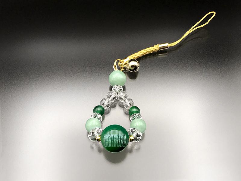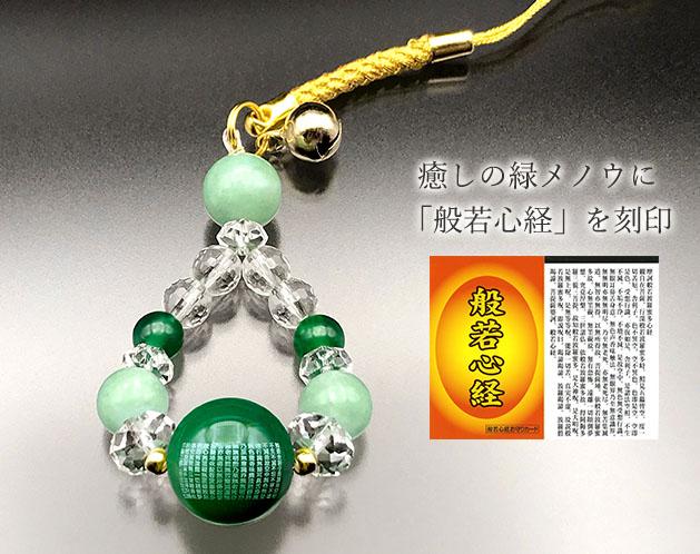 ★有難いお守りストラップ!*600巻におよぶ「大般若経典」の精髄を要約した経典「般若心経」を刻印しました。*緑色は心を癒し心身のリラックス効果があると言われています。◇緑メノウ・・・・・・・・・・・・ストレス緩和・安定・調和◇グリーンクォーツァイト・・癒し・情緒安定◇白水晶・・・・・・・・・・・浄化・願望成就