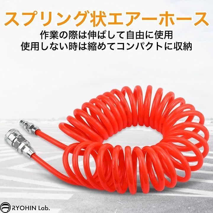 「スプリング状エアーホース」伸縮自在のため、作業の際は伸ばして自由に使用でき、使用しない時は縮めてコンパクトに収納できるスプリング状のエアホースです。