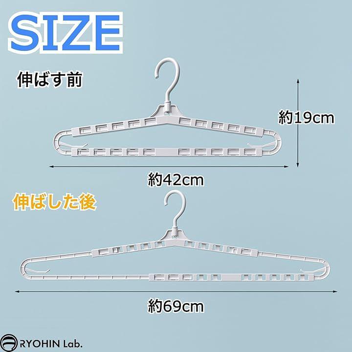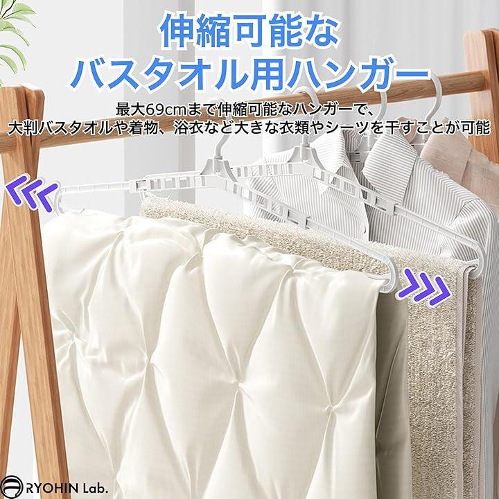 「伸縮可能なバスタオル用ハンガー」最大69cmまで幅広く伸縮可能なハンガーで、大判バスタオルや着物、浴衣、道着などの大きな衣類やシーツを干すことができます。