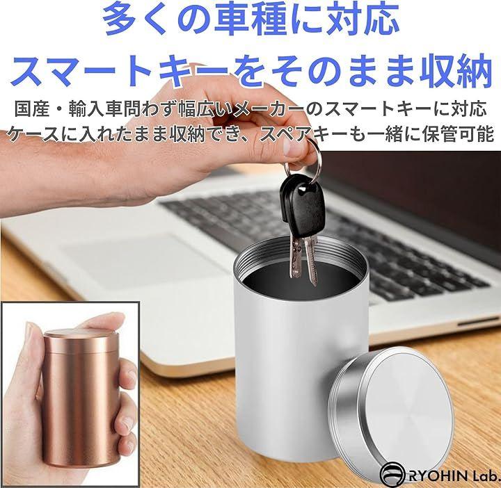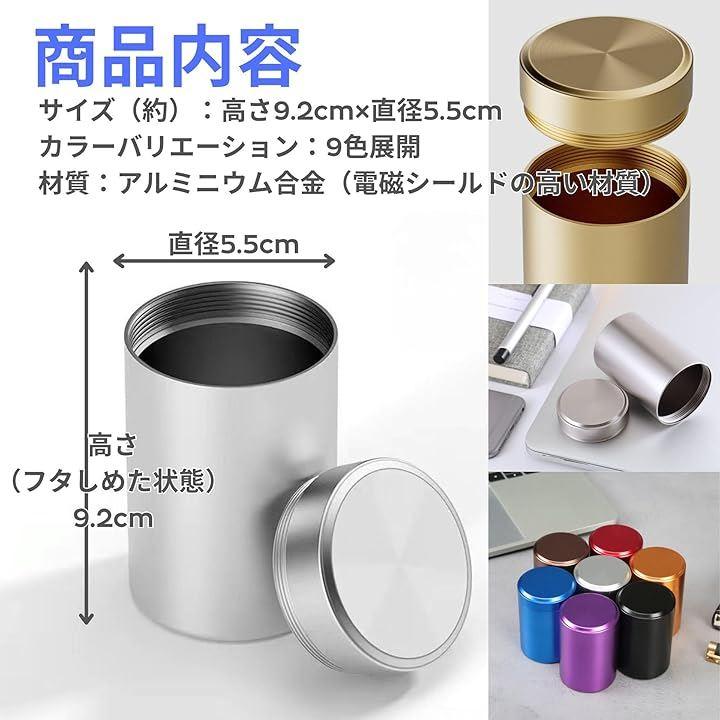 「商品内容」リレーアタック防止収納缶1個、サイズ(約):高さ9.2cmx直径5.5cm、カラーバリエーション:8色展開、材質:アルミニウム合金(電磁シールドの高い材質)