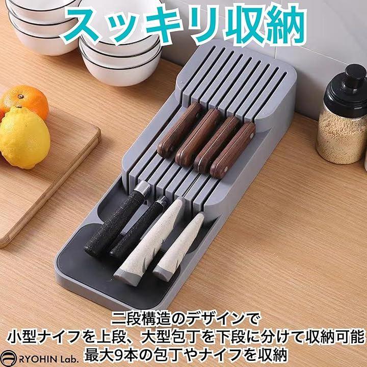 「スッキリ収納でキッチンを整理」二段構造のデザインで、小型ナイフを上段、大型包丁を下段に分けて収納可能な包丁スタンド。