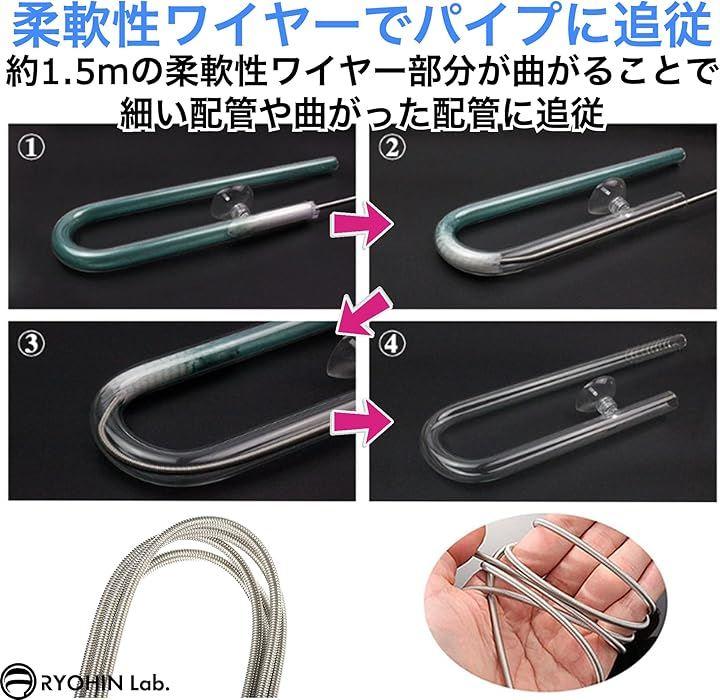 「柔軟性ワイヤーでパイプに追従」最大長さが1.5mの柔軟性ワイヤー部分が曲がることで細い配管や曲がった配管に追従するため、奥まで届いてしっかりと掃除可能です。