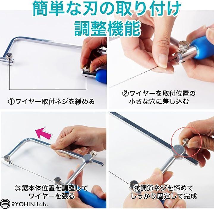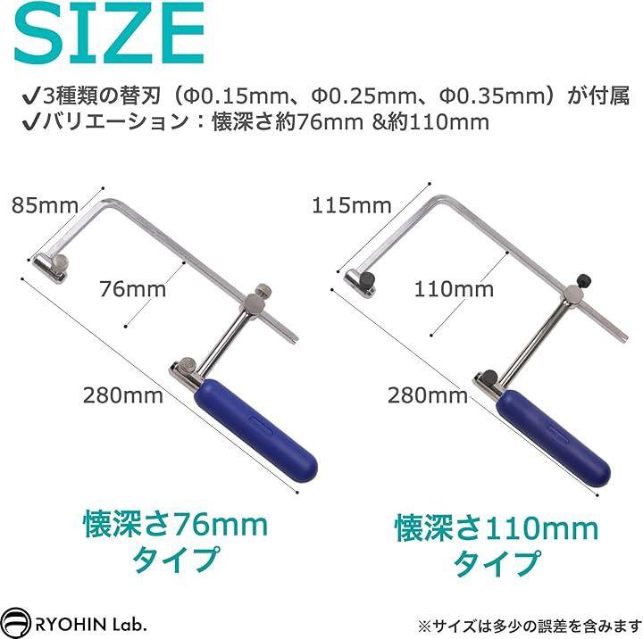 「商品内容」サイズ:糸のこ刃渡り(最大):約180mm・選べる懐深さ:約76mm &約110mm・糸のこ持ち手:約100mm 、付属品:替刃 超極細ダイヤモンドワイヤー Φ0.15mm Φ0.25mm Φ0.35mm 各1m