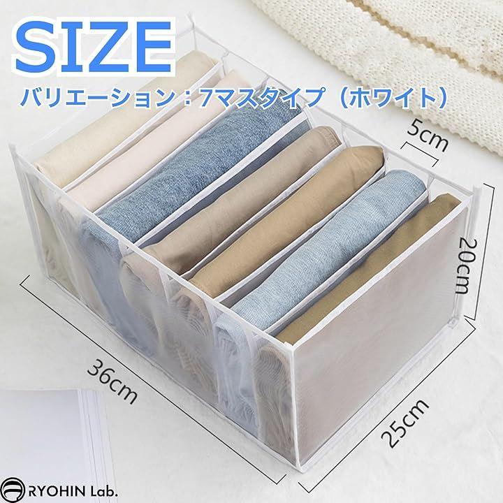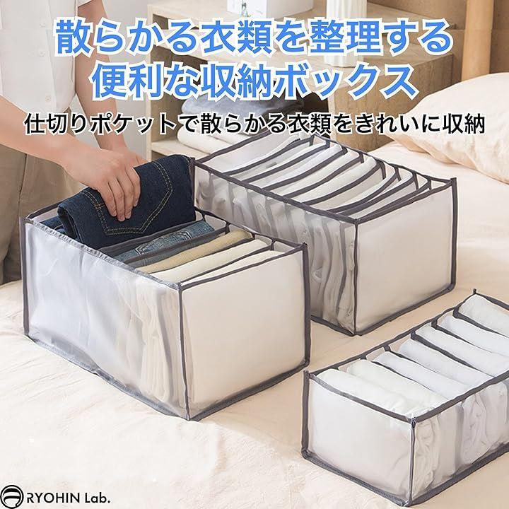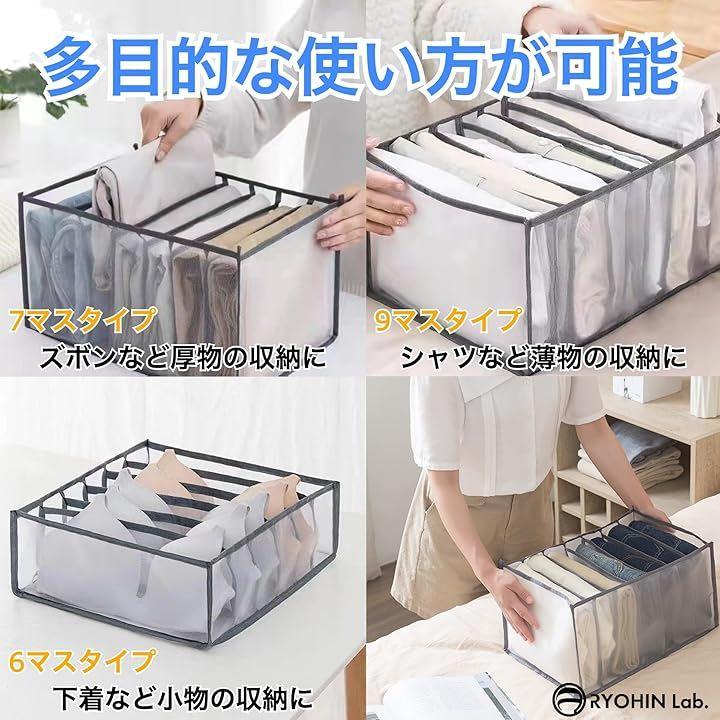 「商品内容」3個セット、カラーバリエーション:ホワイト・グレー、仕切りバリエーション:6マス(下着向け)・7マス(ズボンなど厚物向け)・9マス(シャツやスカート向け)、サイズ(約):32x32x12cm(6マス)・36x25x20cm(7マス)・36x25x20cm(9マス)、材質:ナイロンメッシュ