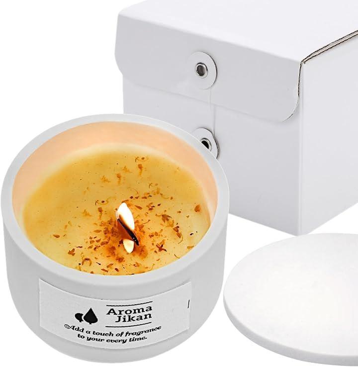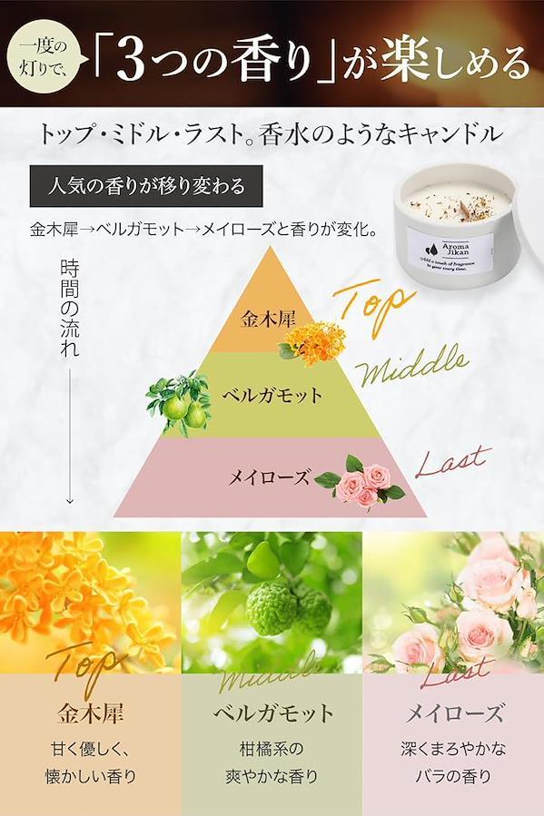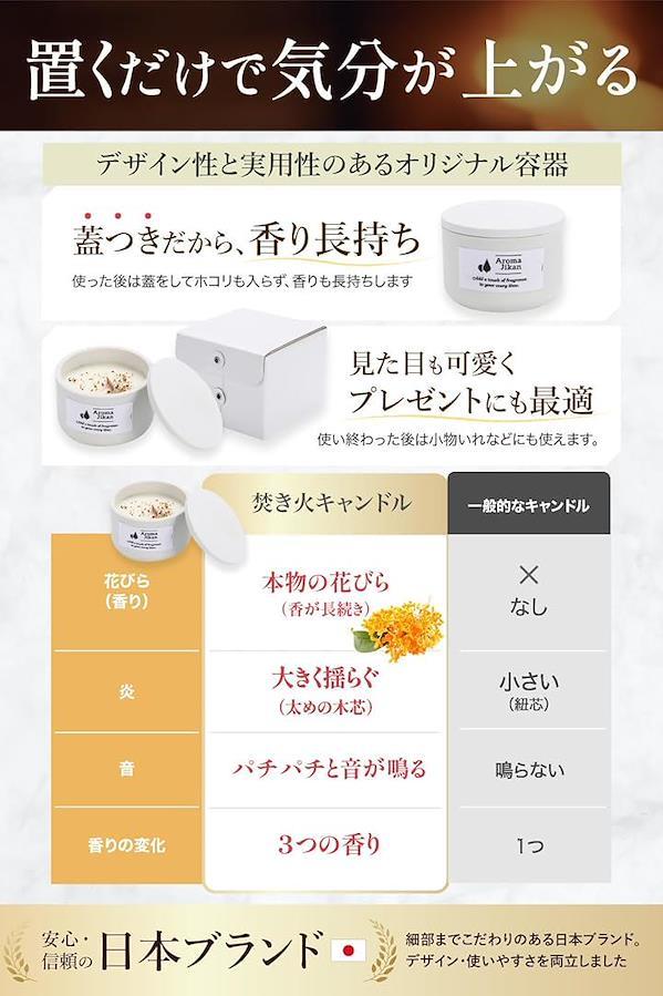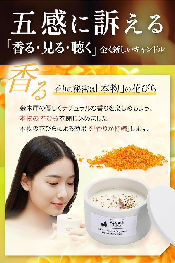 「天然の花びらと木芯の贅沢なアロマ」:キンモクセイの優しい甘さと天然無煙木芯が、自然な炎の揺らぎを生み出します。