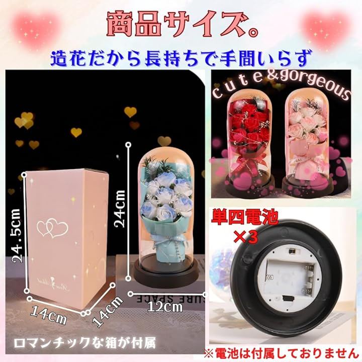 「材質」花:プラスチック クリアードーム:プラスチック ライト:LED「サイズ」高さ24.0cmx幅12.0cmx奥行12.0cm「重量」約200g *多少の誤差がある場合がございますので、ご了承ください。