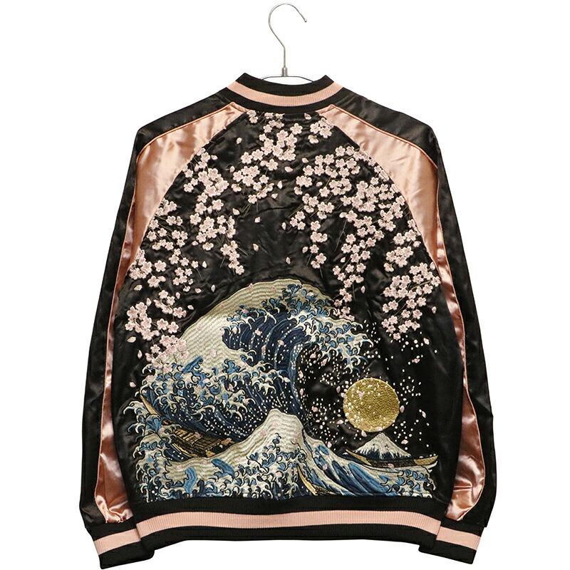 葛飾北斎が手掛けた「富嶽三十六景 神奈川沖浪裏」を刺繍で落とし込んだスカジャン。