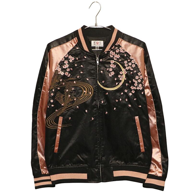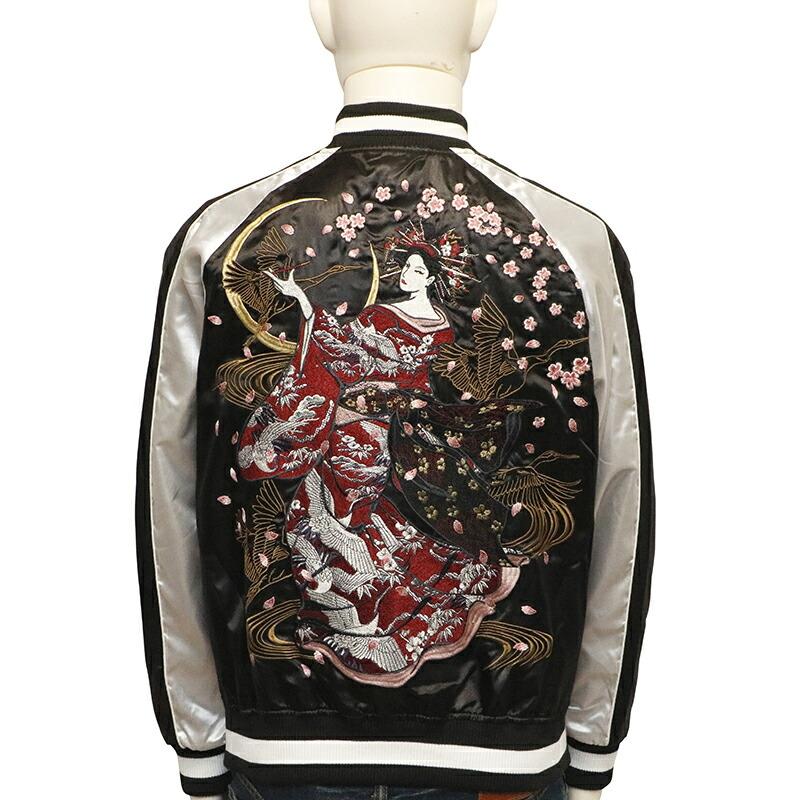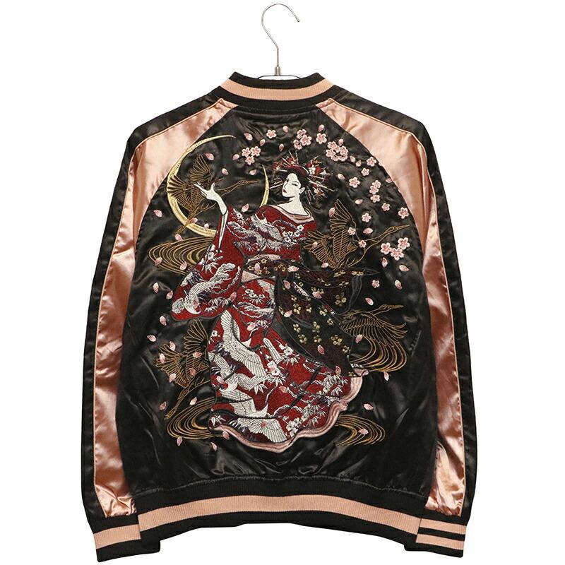 Kachōfūgetsu Oiran Pattern Embroidered Japanese Pattern Sukajan Jacket (3041801) Japanese Pattern Sukajan Jacket Men's Polyester Satin Outerwear Lightweight Outerwear Women's Oiran Kimono Crane Pattern Full Embroidery Available in 3 Colors BLACK×PINK XL
