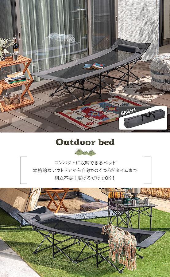 コンパクトに収納できるアウトドアベッド。本格的なアウトドアや自宅のくつろぎタイムなど、様々な場面で役立ちます。組立不要で使う時は広げるだけでOKなので、キャンプ初心者の方でも使いやすい仕様となってます。使わない時は付属のバッグに収納できます。