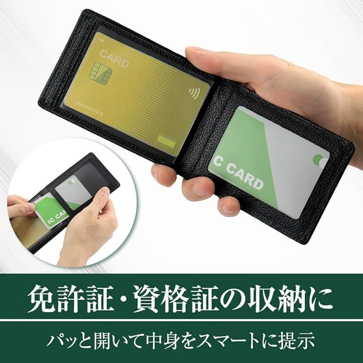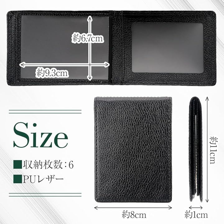 「セット内容」免許証ケースx1点 「サイズ(約)」折り畳み時:11cmx8cmx1cm 窓:9.3cmx6.7cm 「カラー」ブラック 「材質」PUレザー