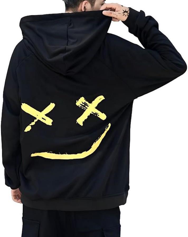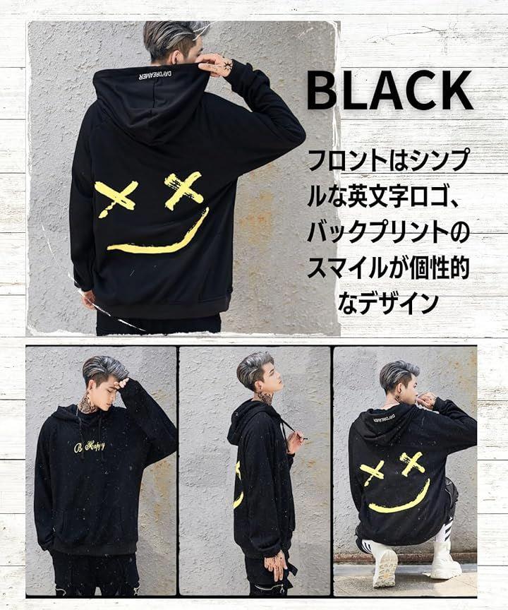 フロントはシンプルな英文字ロゴ、バックプリントのスマイルが個性的なデザインです。