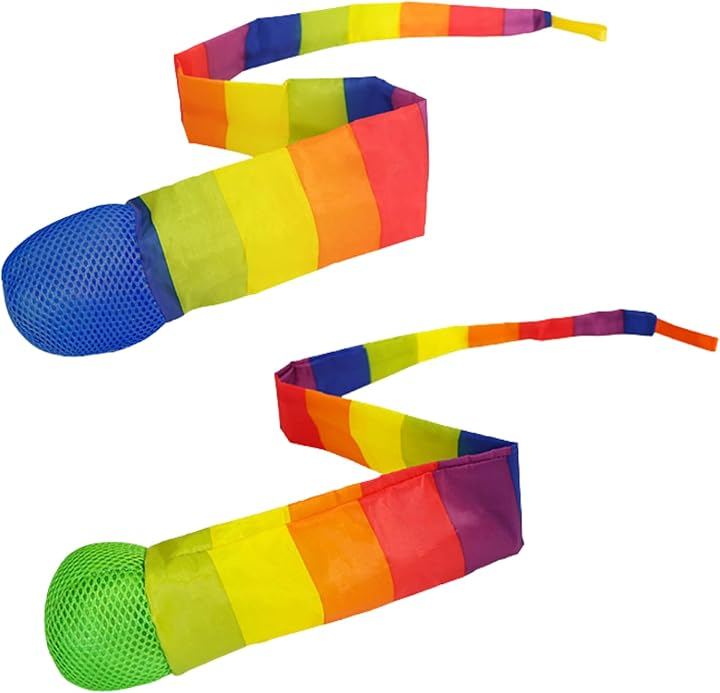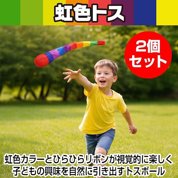 「虹色トス ひらひらボール」 虹色カラーとひらひらリボンが視覚的に楽しく、子どもの興味を自然に引き出すトスボール。