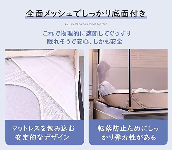 テント式で底までネットをしっかり張れるので、科学製品でなんか不安でしょう、これで物理的に遮断してぐっすり眠れそうで安心、しかも安全。