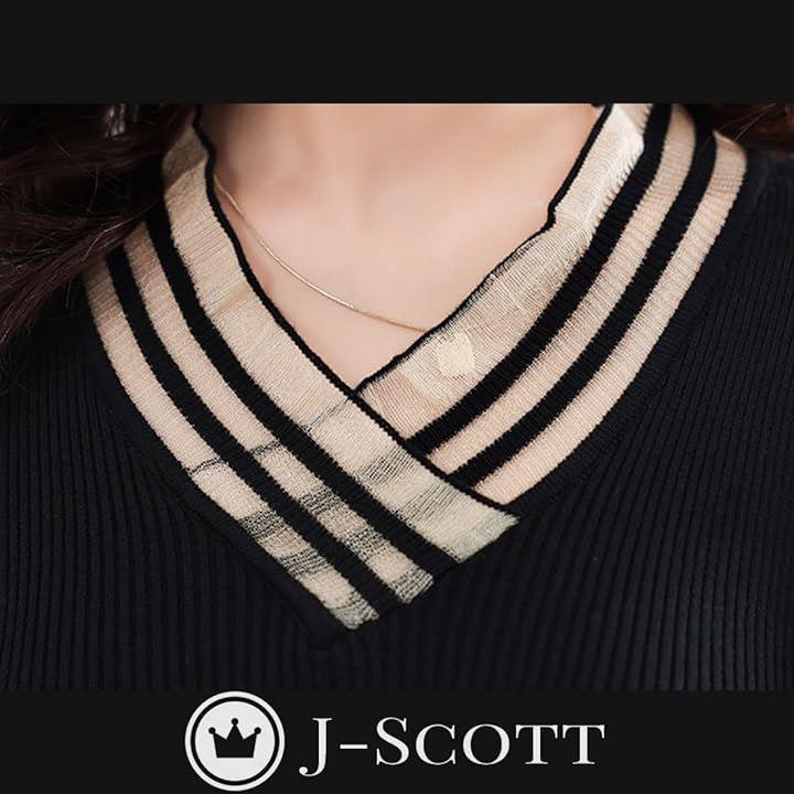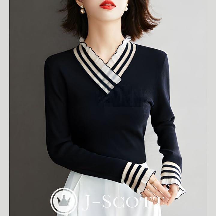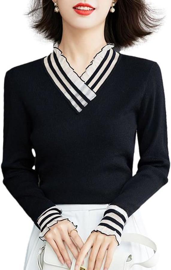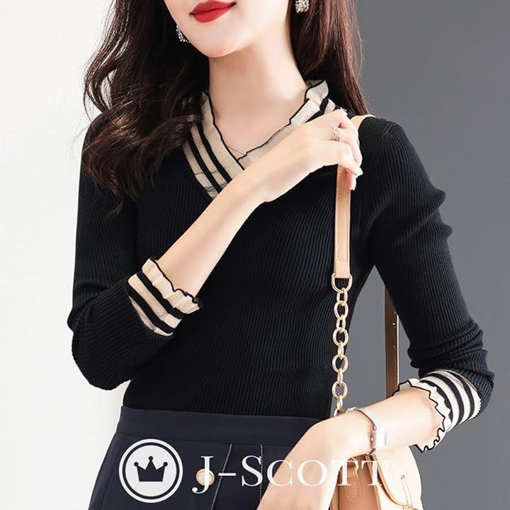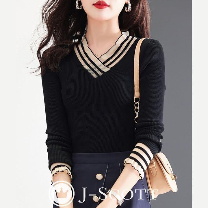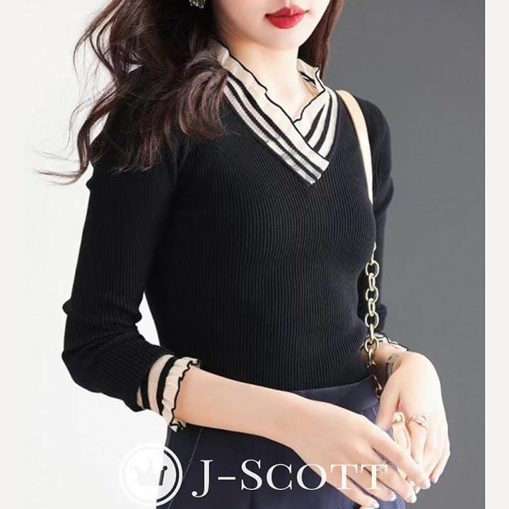 「洗練と華やぎをもたらすニットトップス」 ブラックのリブニットに、衿、袖元のほのかな透け感のある ホワイトニットの切り替えがフェミニンさ増す1枚。