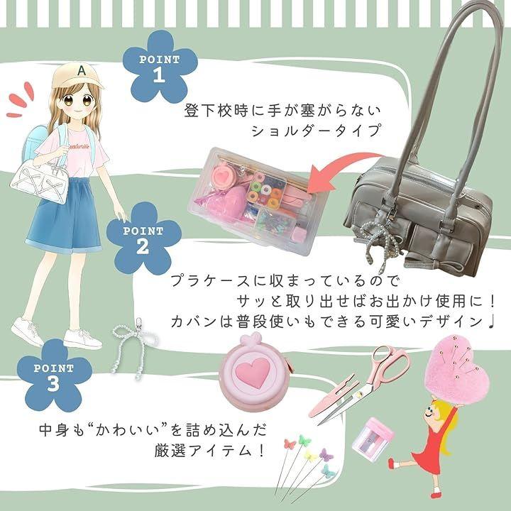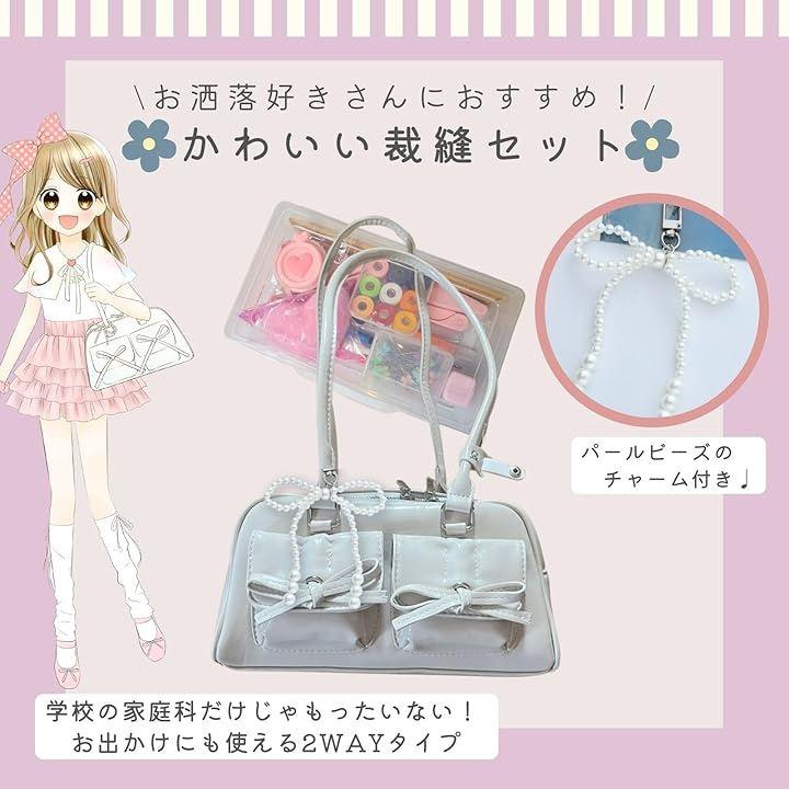 プラケースの中身(22.3cmx12.3cmx5.3cm (1)裁ちばさみ(2)糸切ばさみ(3)手縫い針(4)針山(5)9色糸ボビン(6)まち針蝶々(7)指ぬき(8)リッパーと糸通し(9)メジャー (10)ものさし(11)チャコペン3色(12)折れ針入れ(13)ゴム通し(14)鉛筆削り 可愛いリボンパールチャーム付きショルダーバッグ(ピンク&白) 横幅27cmx高さ14cmx奥行11cm