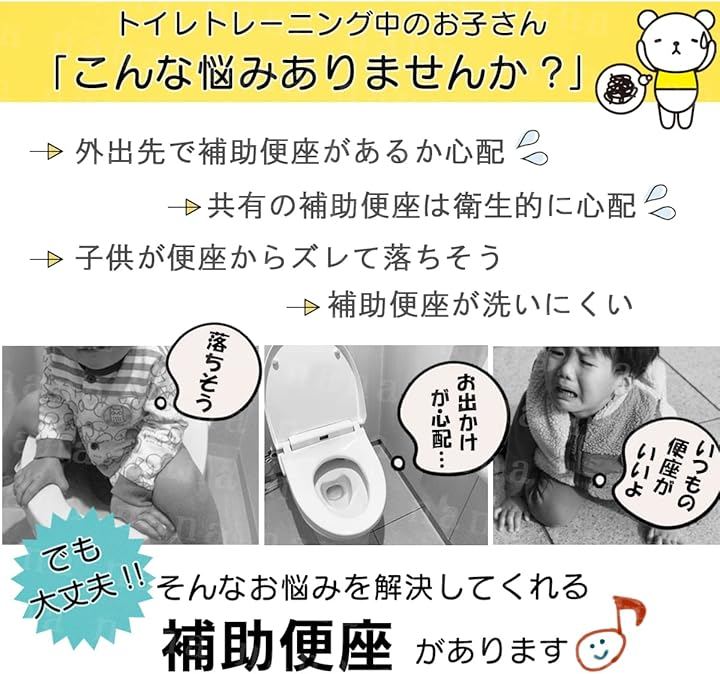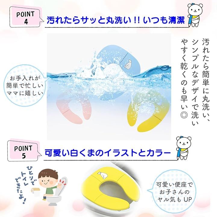 コンパクトに折り畳み出来るので外出先でも大活躍。 吸盤付きなのでずれ難く、トイレトレーニング用として使用可能 水洗いで丸洗い可能。いつでも清潔にご使用いただけます。