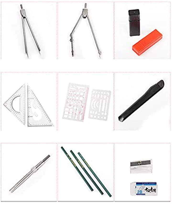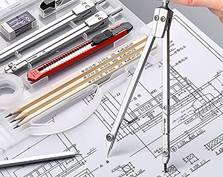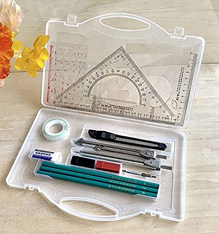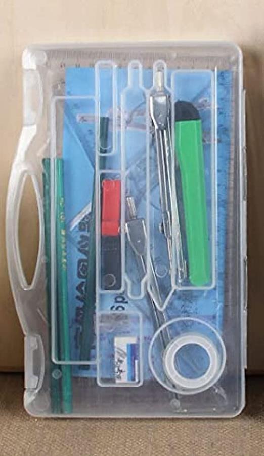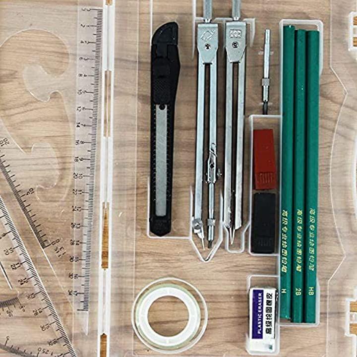 セット内容:大型三角定規、大型デバイダー、大型コンパス、鉛筆(2H,2B,HB)、消しゴム、テープ、カッターナイフ他。