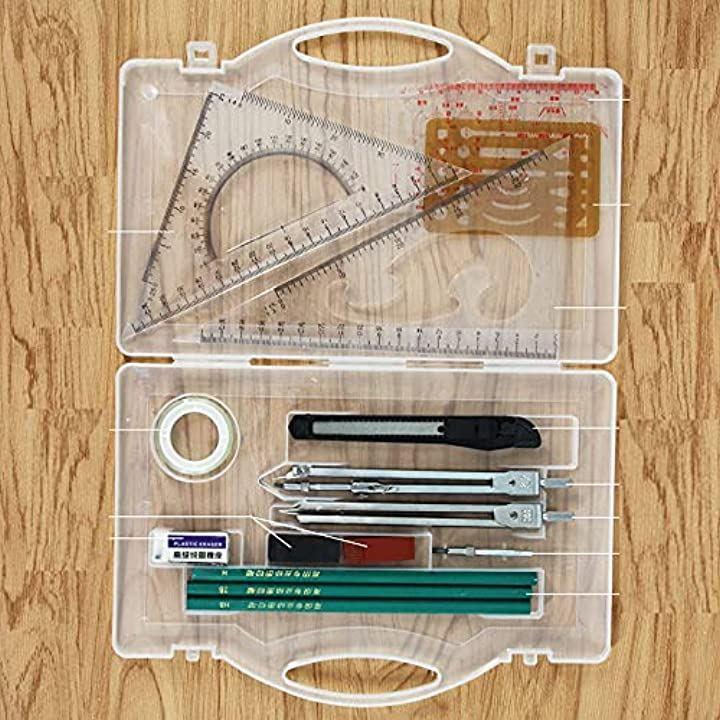 ・セット内容:大型三角定規、大型デバイダー 、大型コンパス 、鉛筆(2H,2B,HB) 、消しゴム、テープ、カッターナイフ 他。