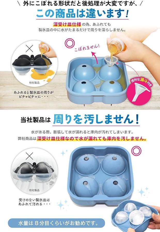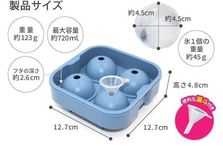 「サイズ」12.7x12.7x4.8cm 「重量」約123g 「氷の数」4個 「氷サイズ」直径 約4.5cm 「付属」漏斗 1個