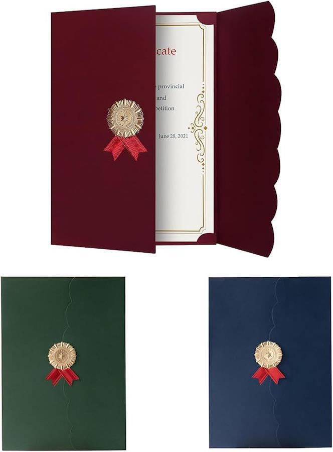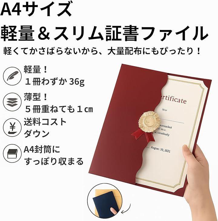 デザイン性: 金のエンブレムと赤いリボンが付いた高級感のある証書ファイル。