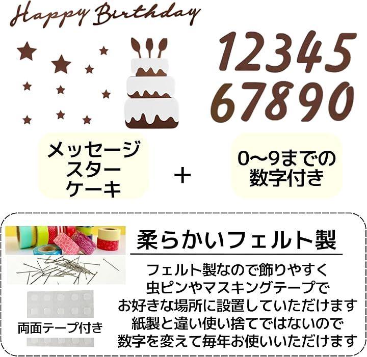 「仕様」サイズ:Happy Birthday 約7.5x56.5cm(1列に並べた場合) ケーキ:約24x14cm スター:約2.5~4.5cm 数字:約15cm 素材:フェルト カラー:コーヒー/ブルー/レッド