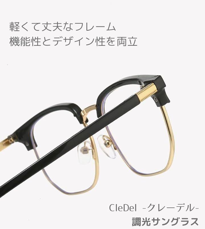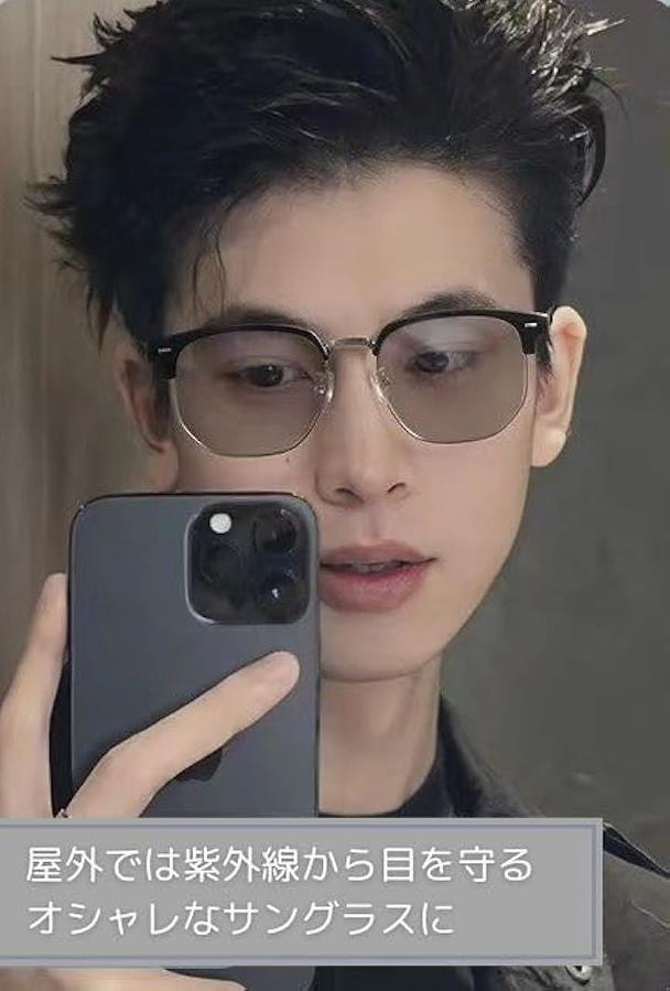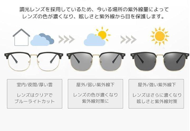 「調光ブルーライトカットレンズ採用」 紫外線に反応して色が変わる調光レンズを採用。屋外に出たときは色が濃くなり、室内に入ると徐々にレンズカラーが薄くなります。