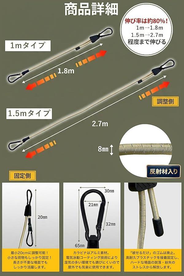 150cmタイプ: 大型コンテナの固定、タープの設営、車内の荷物整理など、幅広い用途に対応。